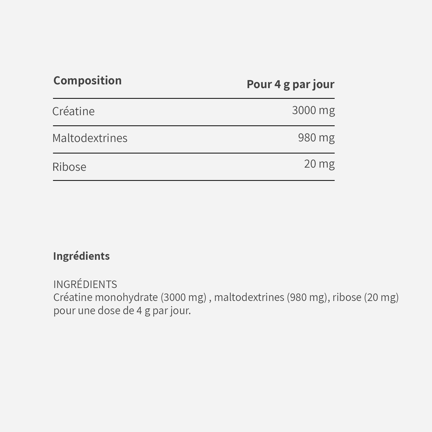 K-20 vous apporte 3000 mg de Creapure par dose de 4 g de K20. Votre corps produit naturellement de la créatine à partir de trois acides aminés : l'Arginine, la Glycine, la Méthionine puis la transforme en phosphocréatine.