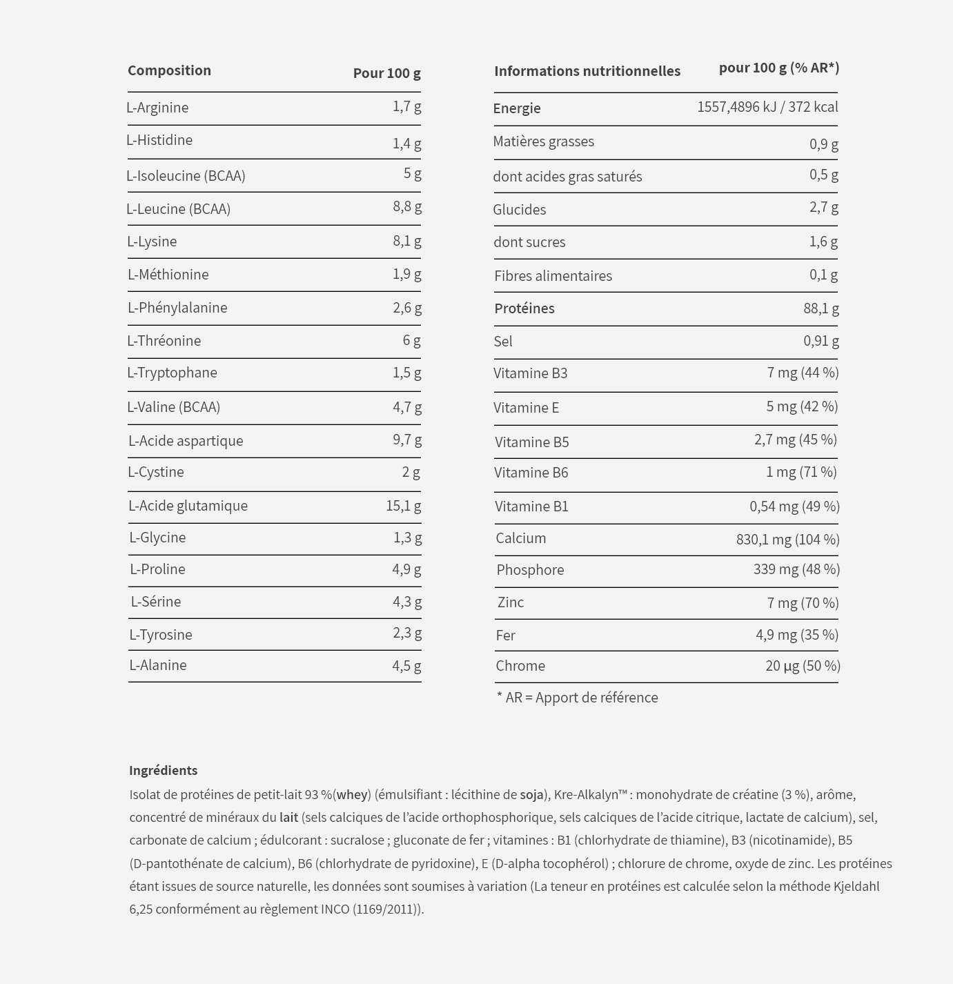 Isolat de protéines de petit-lait93 %(whey) (émulsifiant : lécithine desoja), Kre-Alkalyn™ : monohydrate de créatine (3 %), arôme, concentré de minéraux dulait(sels calciques de l’acide orthophosphorique, sels calciques de l’acide citrique, lactate de calcium), sel, carbonate de calcium ; édulcorant : sucralose ; gluconate de fer ; vitamines : B1 (chlorhydrate de thiamine), B3 (nicotinamide), B5 (D-pantothénate de calcium), B6 (chlorhydrate de pyridoxine), E (D-alpha tocophérol) ; chlorure de chrome, oxyde de zinc.